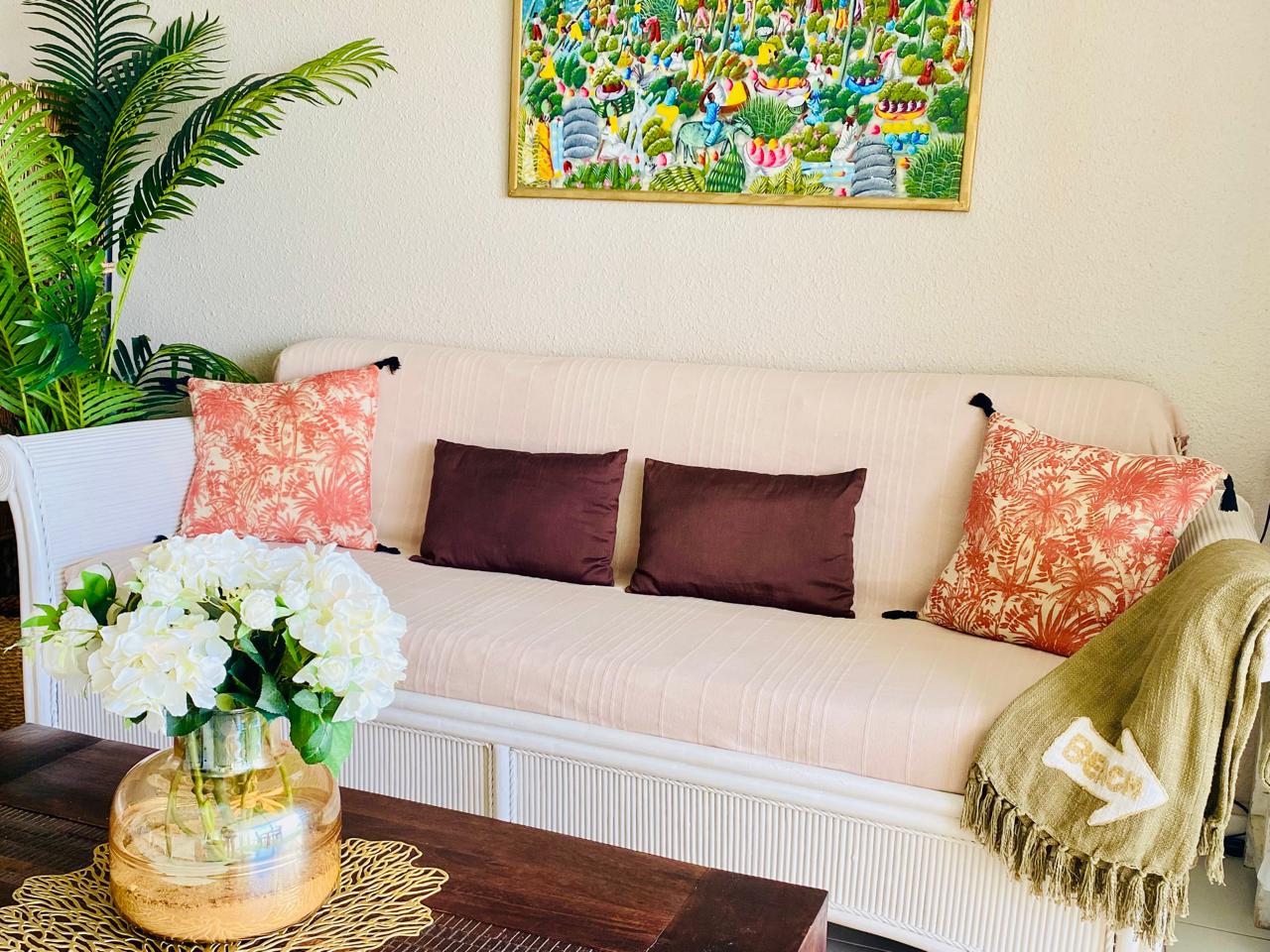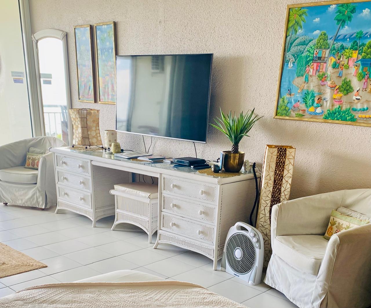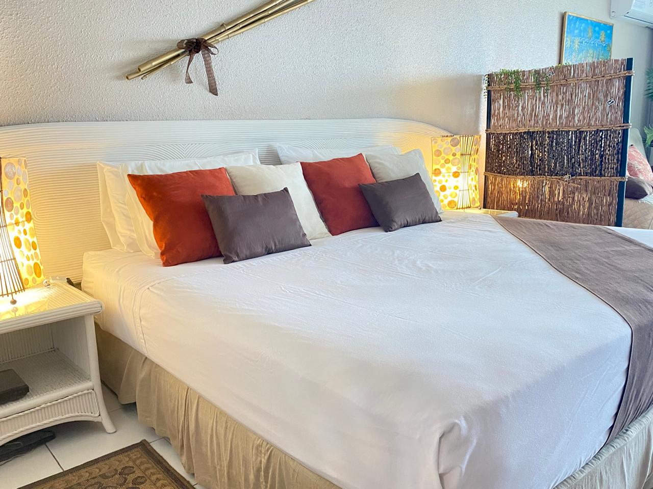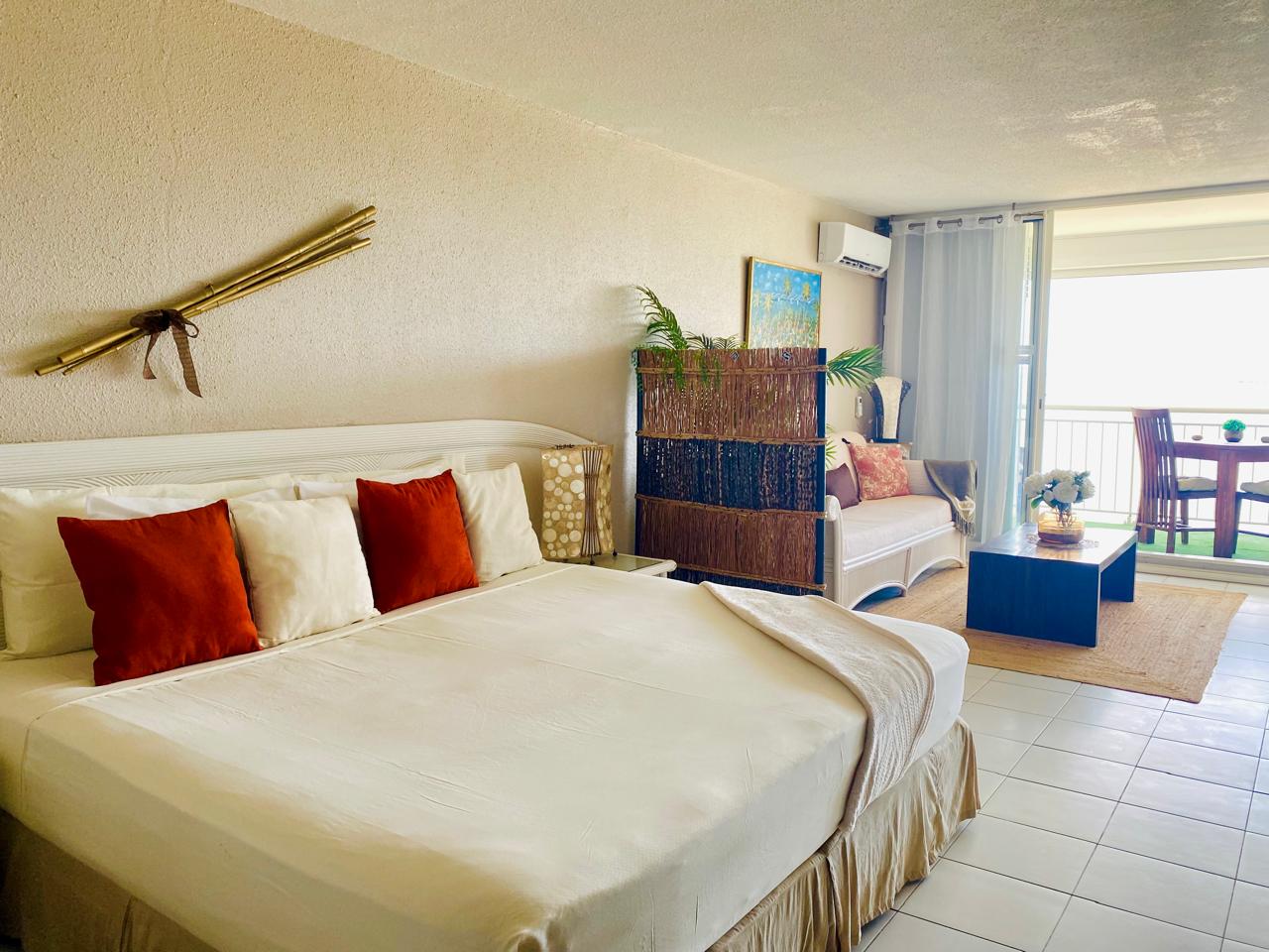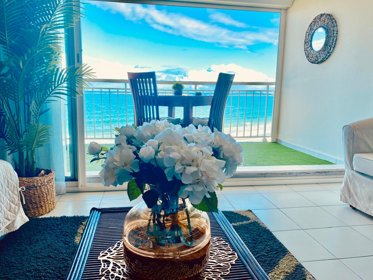 Soft tones, elegant off-white rattan furniture, and a warm, stylish decor create a romantic and welcoming space. A full-height sliding glass wallopens entirely, extending your living area toward the sea and letting the ocean breeze flow through.